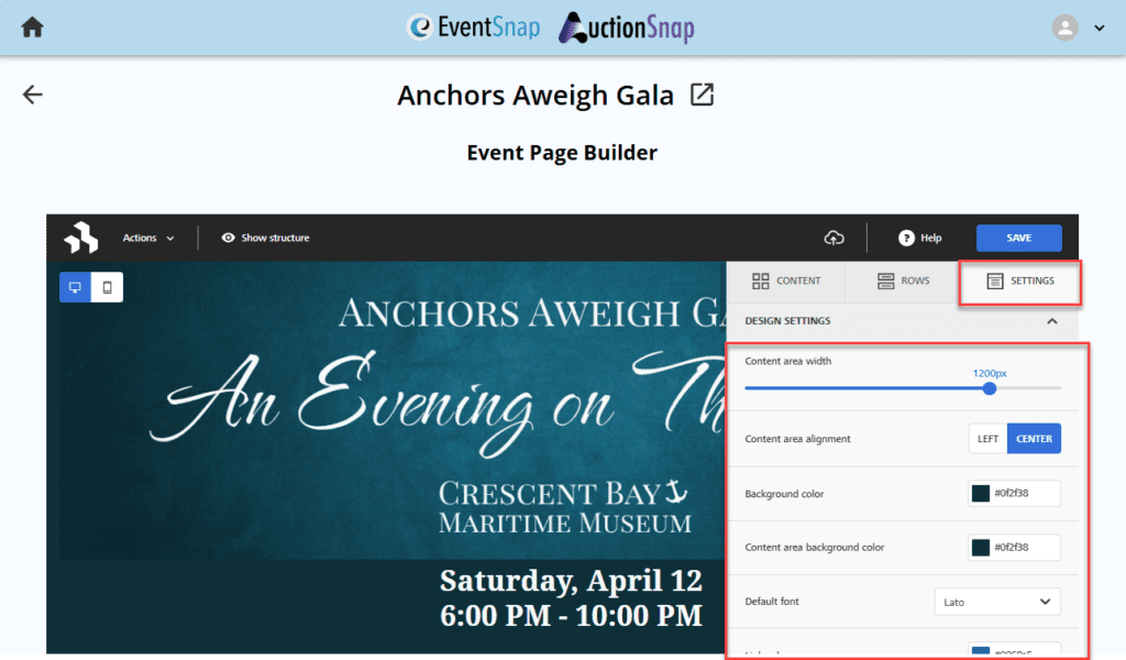 For more information on how to use the page builder, visit https://docs.beefree.io/end-user-guide/builders/page-builder. Note that all features described on this third party help page may not be available in EventSnap.